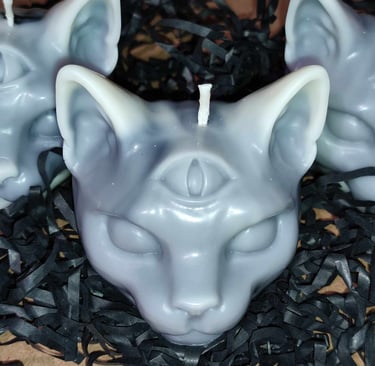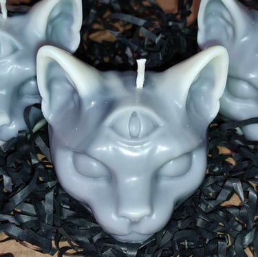 Découvrez ces magnifiques bougies en forme de tête de chat, parfaites pour décorer vos étagères à la venue d'halloween !